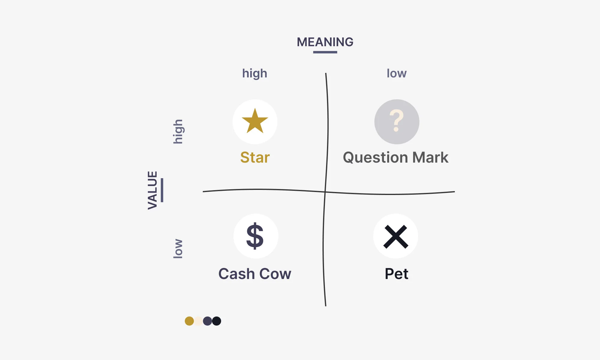 Stars are the things to double down on. They have high meaning and high value. They are the core activities (or tasks, or goals) you should spend the most time working on.