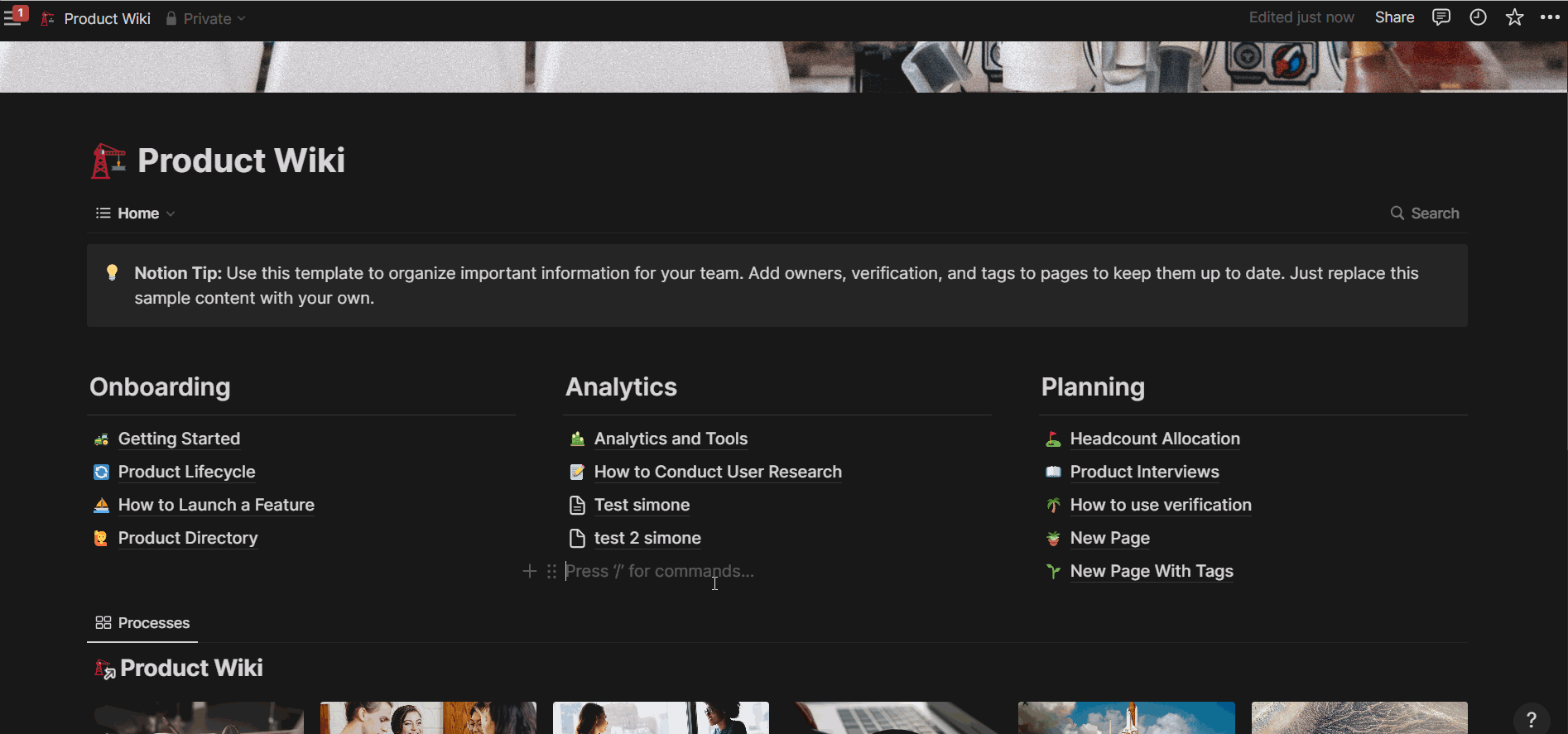 The home page can have a flexible layout like any other page in Notion. You can also find a search 🔍 icon at the top right corner of the Home page, a pre-filtered search bar allowing you to search across your Notion Wiki (and nothing else). When you add a page to the Wiki Home, it will also show up on your Wiki database, where you can assign an owner, add a verification expiration, and any other property you may have in your database. Pages in the Home are database pages but differ from the usual database structure of Notion. Pages in the Wiki Home can be moved freely, while still remaining part of the database.