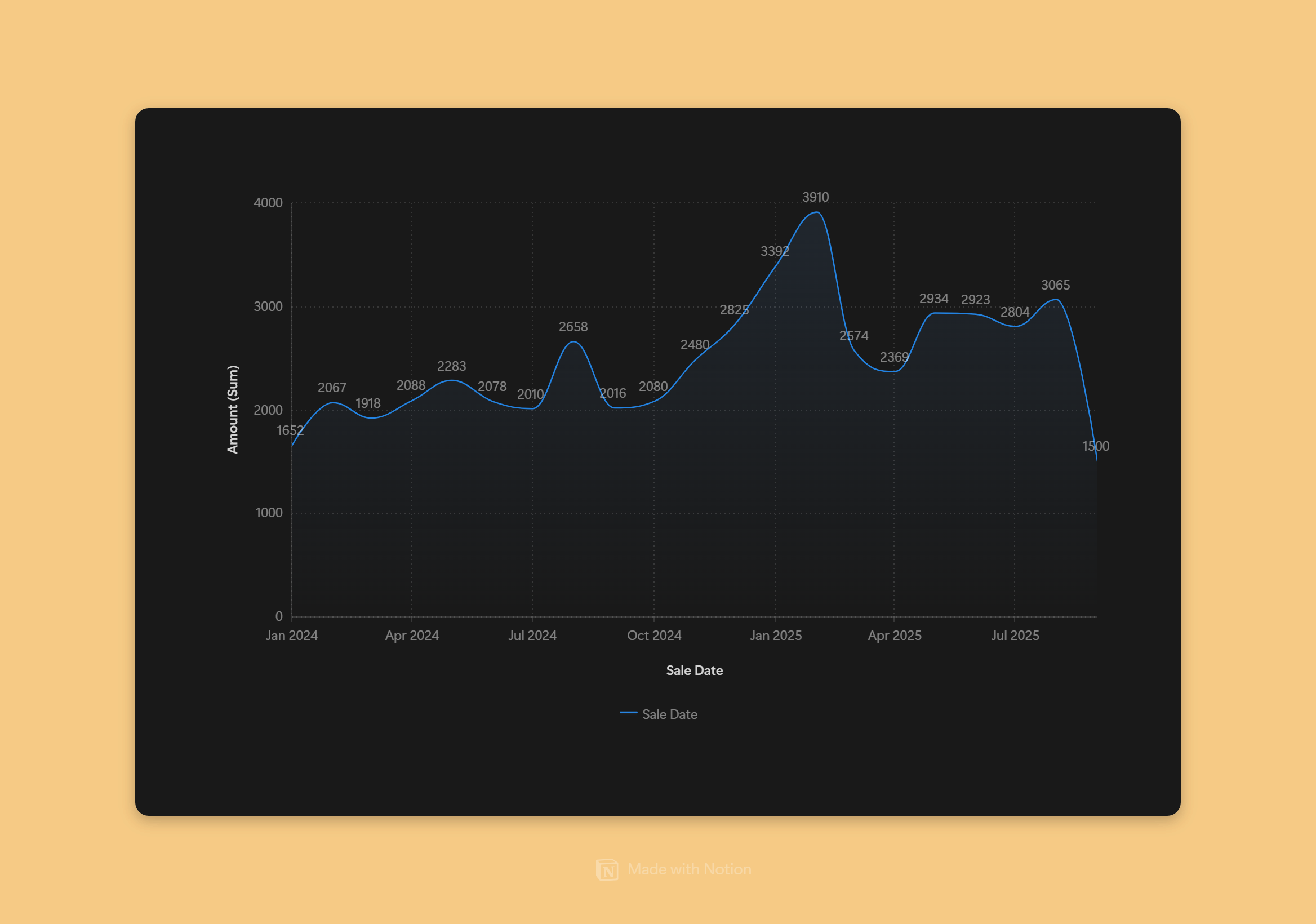 First, we can create chart views of the sales data. For example, revenue by day/month/week/year; sales amount by period; sales amount by product; and so on, depending on what you wish to visualize. These graphs, which can also be exported as SVG/PNG very easily, provide a first layer of clear visibility over the sales data, which can inform your decisions for existing products, new products, business lines, and anything else applicable.