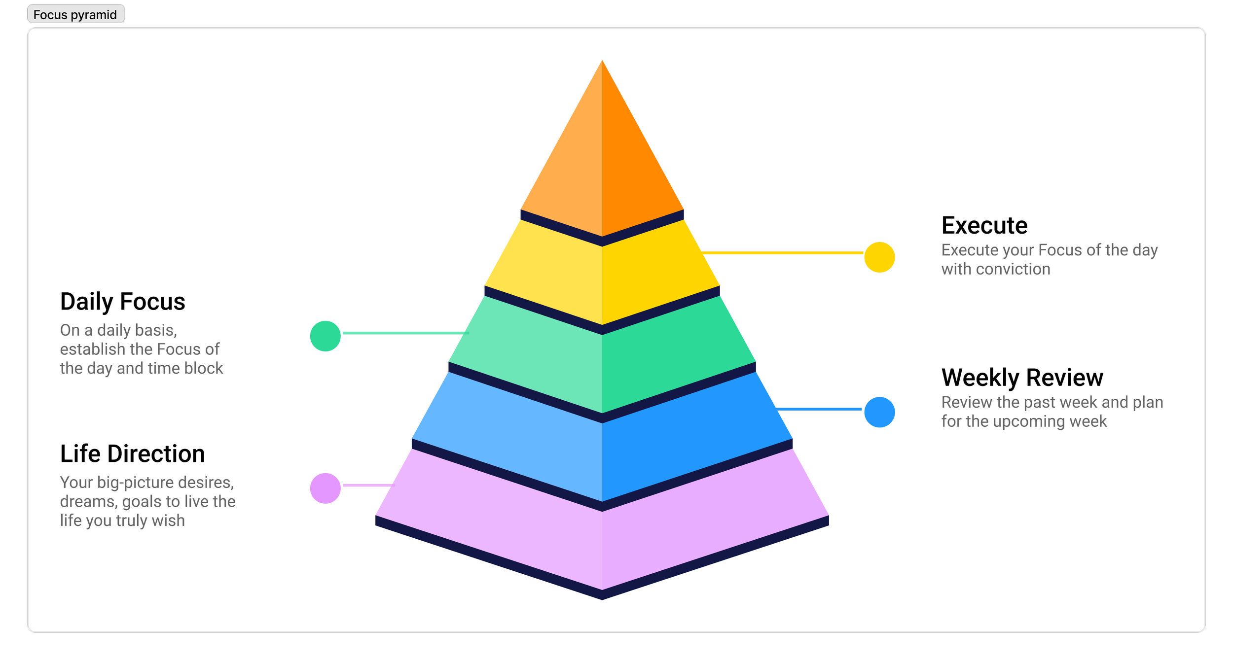 Daily, establish the Focus of the day — the specific Project(s) and/or Task(s) you are going to focus on that day. See Oliver Burkeman’s 4000 Weeks—Time Management for Mortals for details about mindsets and strategies for narrowing down the focus.