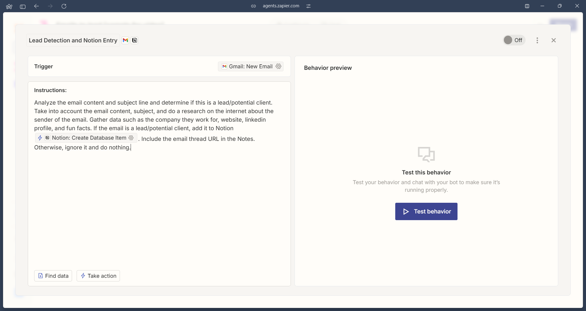 I started by creating a Zapier Agent, and then setting up a Behavior from the dedicated section within the “Configure” tab. I selected the trigger “Gmail: New Email”, which starts the Automation whenever there is a new email in your Gmail account. You can switch this for Outloook or other email providers as needed.