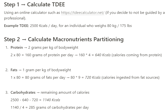 In the nutrition hierarchy, macronutrients occupy the second place of importance. These are protein, carbohydrates, and fats (which can be broken down into subcategories — e.g. fats are divided into saturated, monounsaturated, polyunsaturated, trans fats). While calories are the very foundation from where to begin the exploration of the nutrition world, a balanced macronutrient partitioning plays a key role, particularly for our body composition. The second step which characterizes the process of following a balanced, healthy eating regimen is to figure out how to split the calorie goal set in the TDEE calculation phase into protein, fats, carbohydrates. Although there are various approaches to macronutrient partitioning (i.e. the distribution of macronutrients —e.g. the ketogenic diet emphasizes fats over carbs), a healthy nutritional intake seems to be characterized by a balanced distribution of macronutrients, as the term healthy embodies balance and long-term consistency. When choosing your macronutrients intakes, therefore, you start from setting the quantity of protein you are going to eat daily (generally speaking in the range of 1.2 to 2 grams per kg of body weight), then fats (at least 1 gram per kg of bodyweight — fats provide 9kcal/gram), and you lastly allocate the remaining amount of calories to be consumed (based on your TDEE and goal) on carbohydrates. Protein and carbohydrates provide 4 kcals per gram (i.e. 1g of protein/carbohydrates = 4 kcal).