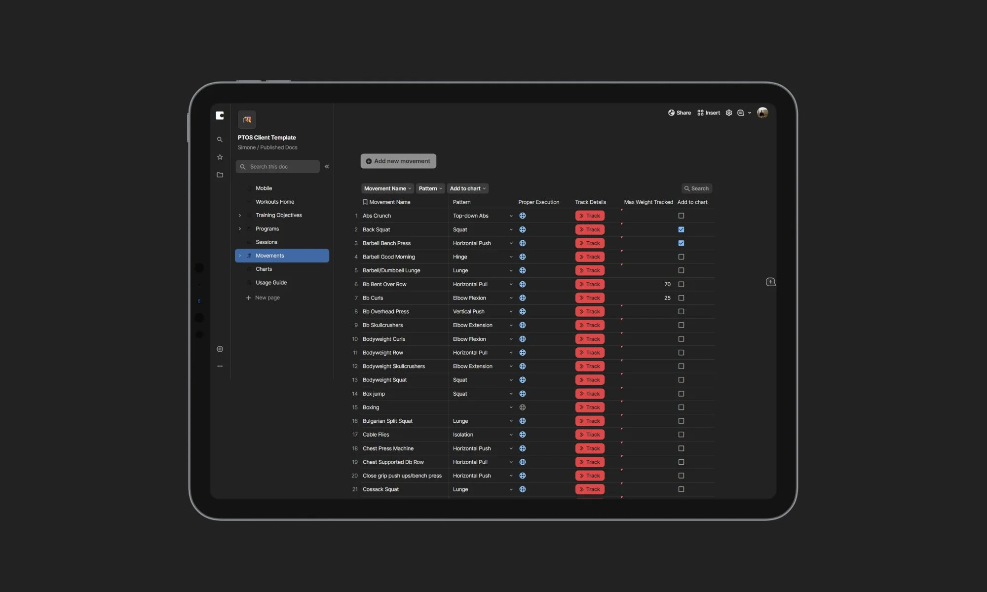 PTOS Client Template: the template used to create each client doc with the click of a button, from the Clients table mentioned above. Each client will have one doc that you can share with them. You can customize the contents of this template to your own liking if necessary. It is key that you add all the exercises you want to use in your programs to the “Movements” table in the template before officially starting to use the system.