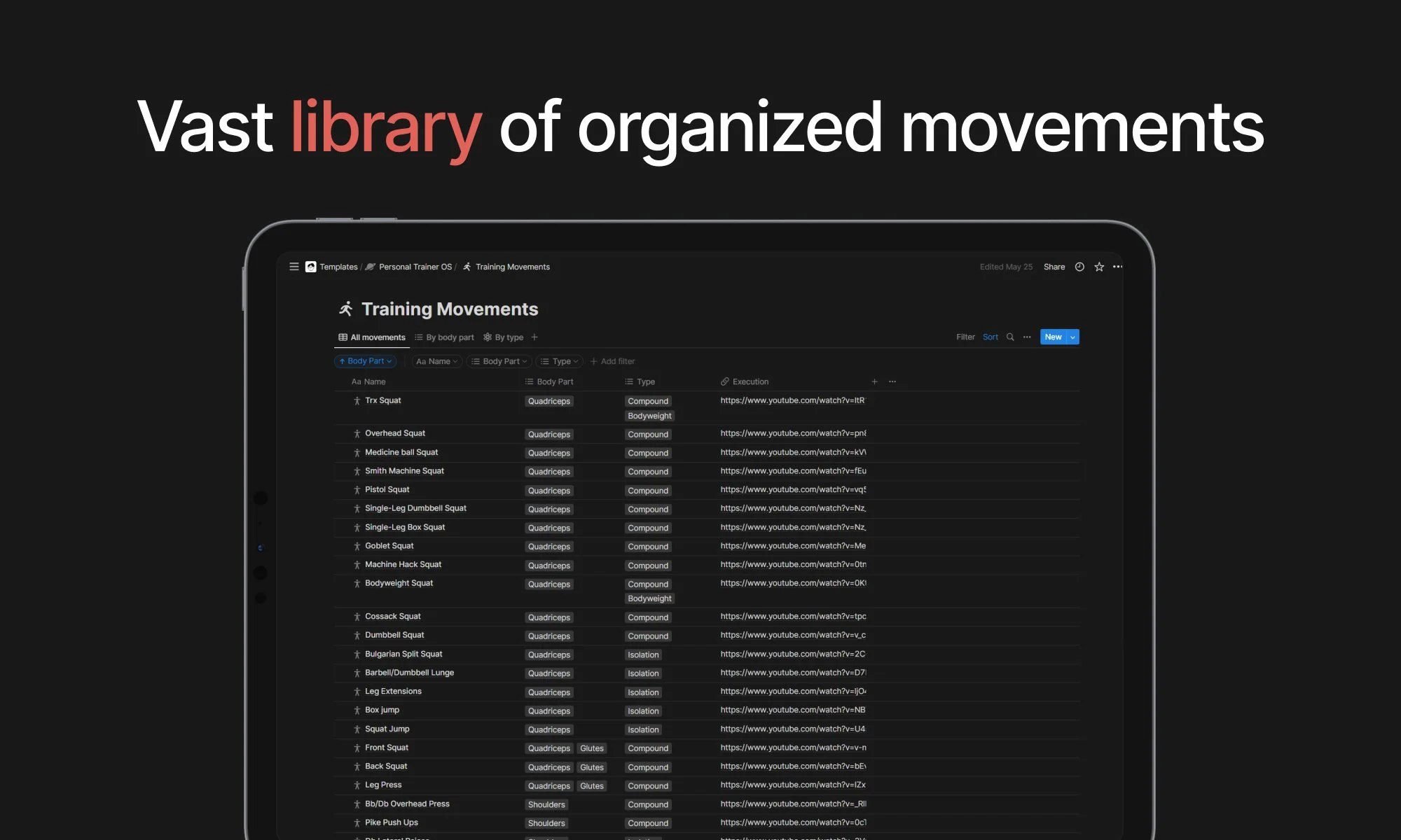 For each client, you can create multiple training programs in Notion over time. Each program can target one or multiple training adaptations. Each training program is composed of sessions (daily workouts), which, in turn, are composed of exercises that you can also reference from the master “Reference Movements” database. When you duplicate the Personal Trainer OS Notion template, you can revise the Reference Movements database by adding, removing, or editing the exercises and demo video.